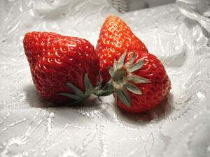 刚看到的时候我怀疑它染过色,整个是深红色的,一般市面上的草莓都多少会有黄色这个完全没有,咬下去的时候我又怀疑它加过糖,超~~~级的甜!平时吃草莓的时候里面都白的,那种个头很大的里面常会空心或是硬心,是用农药和催长的后果,这个完全没有,从里到外都是熟透的红,心也软软的,我从来不知道原来草莓是这个味道的!!!而且外皮舔起来口感也不一样[你到底怎么吃草莓的]卖草莓的说他包了个大棚自己种!我百分之二百的相信!!